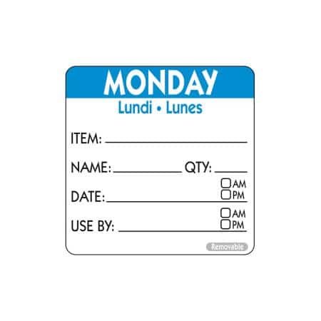 Our food safety labels are ideal for ensuring HACCP compliance and minimising waste due to food spoilage. Every label contains Monday, which is colour-coded blue for easy recognition, and also has a use-by part to fill out.