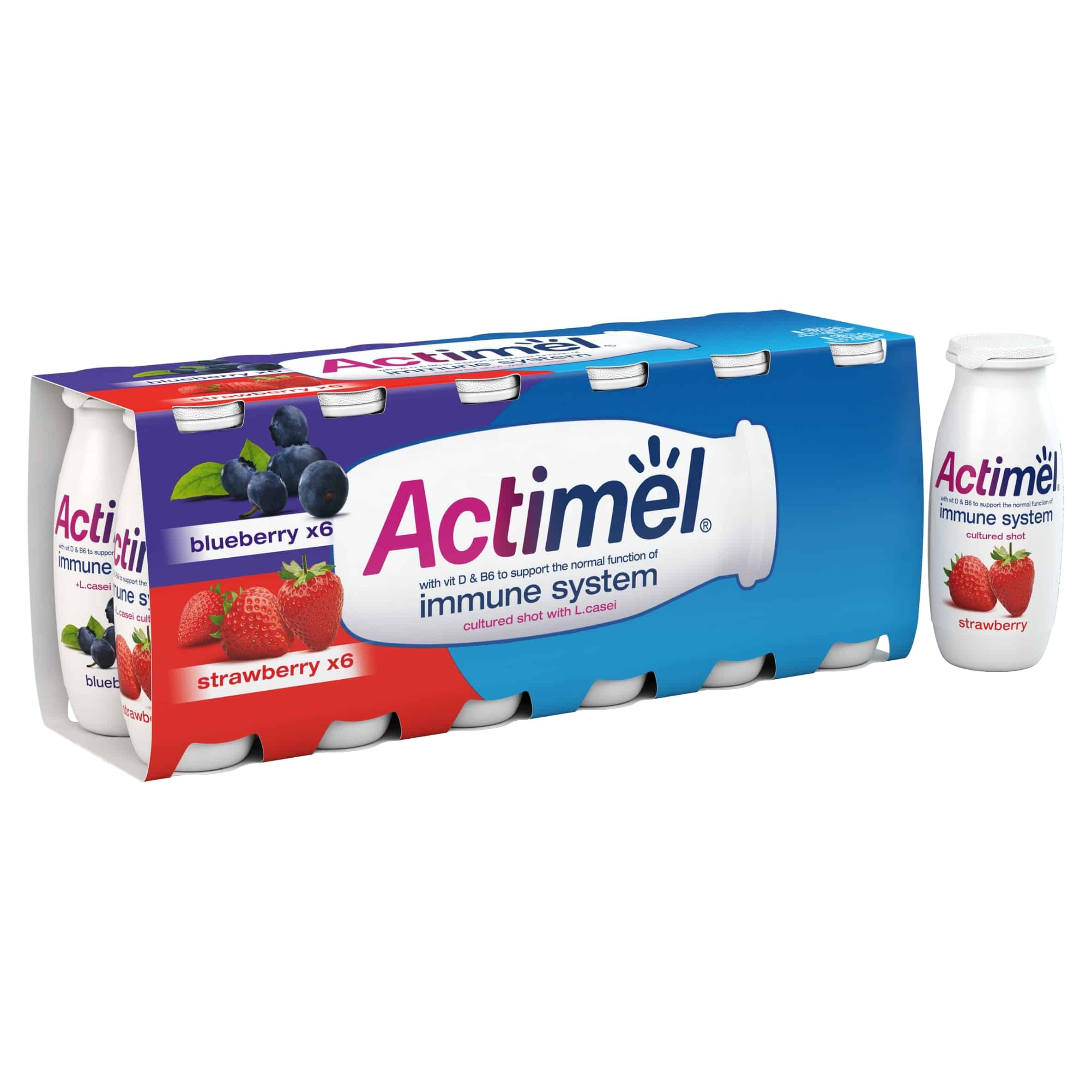 Boost your immunity with Actimel Immune Support Yogurt Drink in delicious Strawberry & Blueberry flavor, available in convenient 12 x 100g packs.