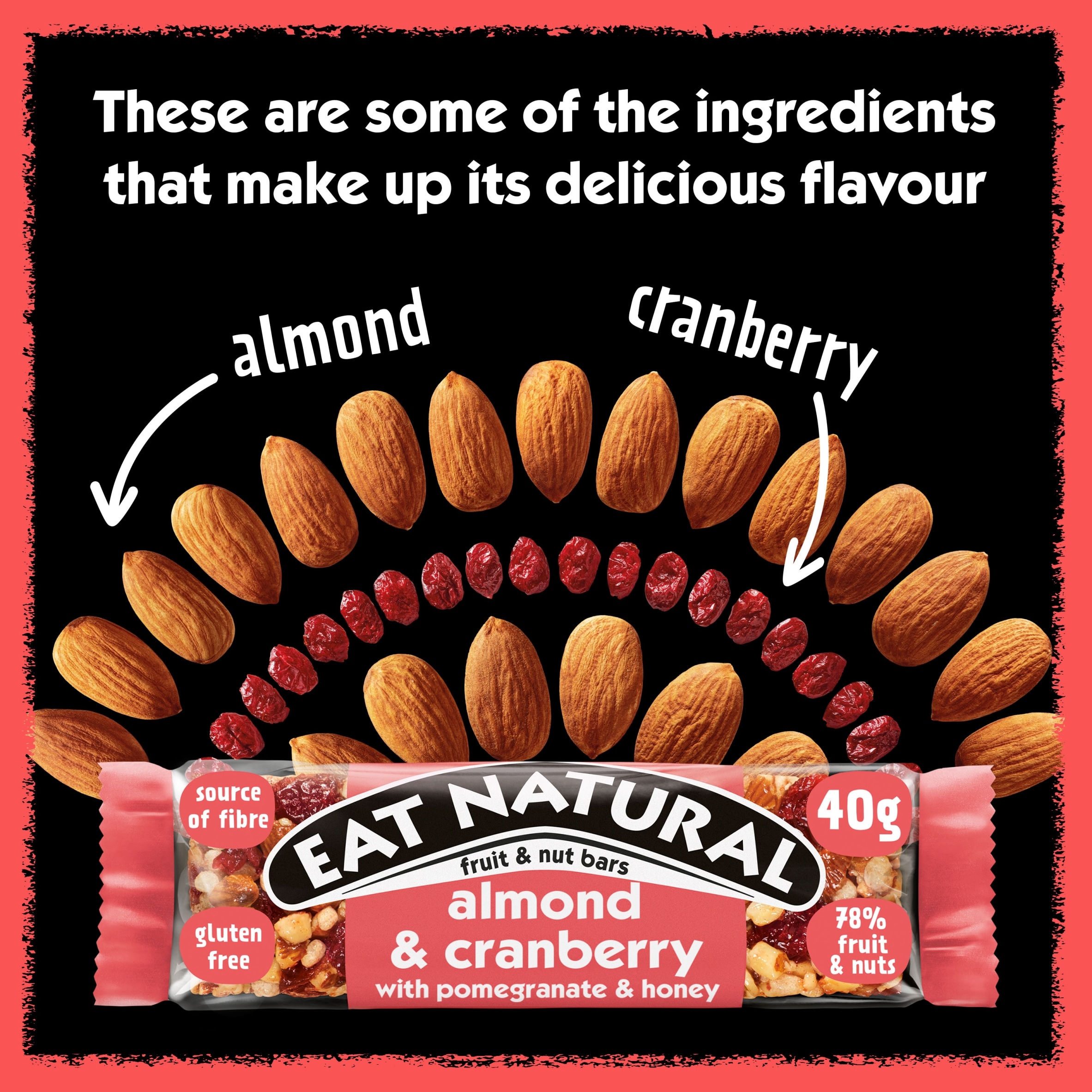 Indulge in Eat Natural Fruit & Nut Almond & Cranberry Bar with Pomegranate & Honey for a delicious, nutritious snack experience.