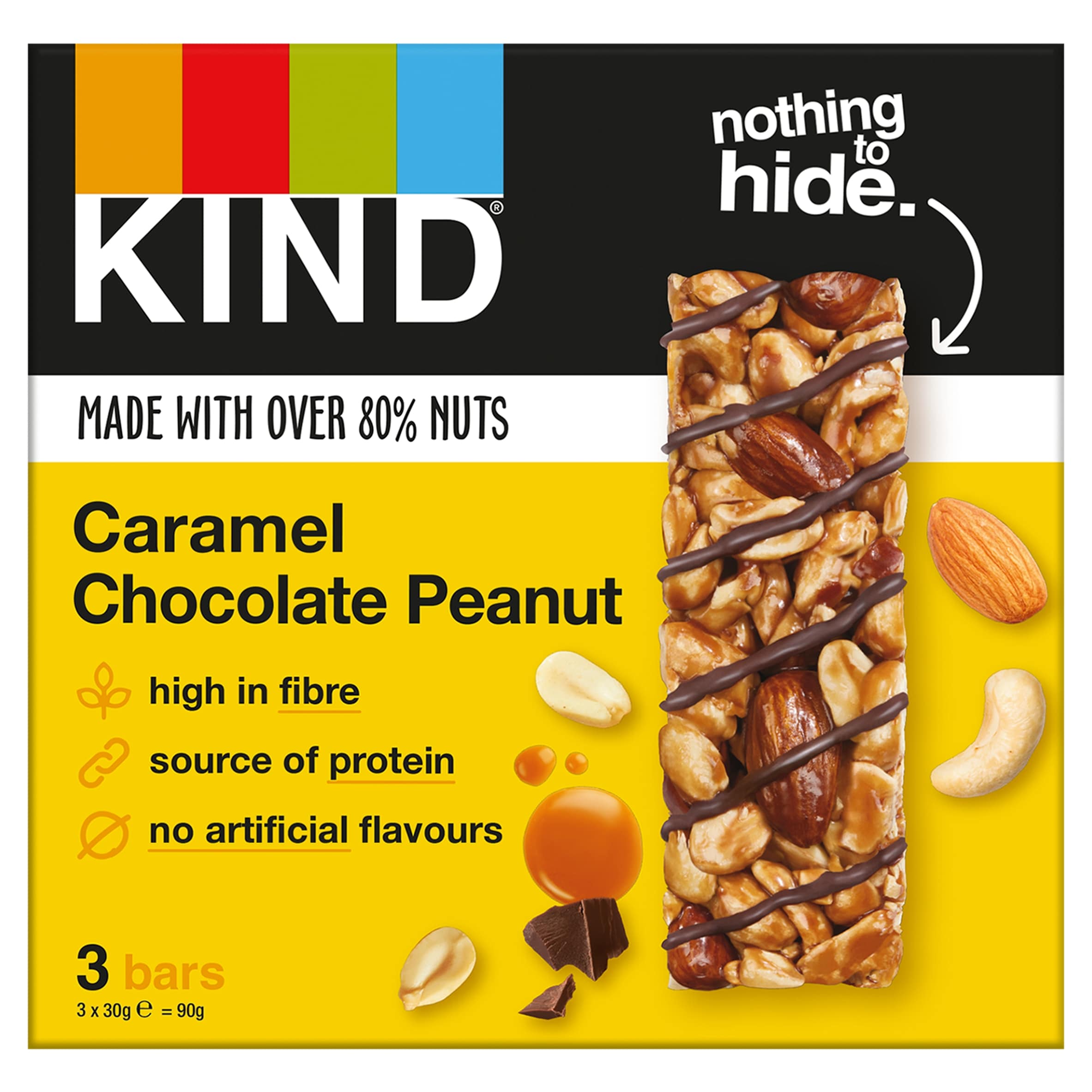 Indulge in KIND Caramel Chocolate Peanut Mixed Nut Bar 3x30g, a delicious snack combining rich flavors and wholesome ingredients for energy.