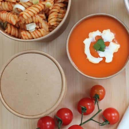 These 16oz vented heavy-duty takeaway soup lids are completely paired with our heavy-duty Kraft soup cups (16oz) that are for serving delicious hot soup to your customers without burning their fingers. Made from PP-lined natural Kraft paperboard. Extraordinarily durable, offering excellent value and performance.