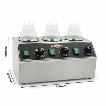 Holds 3x 600ml or 1L sauce bottles3x triple spout bottles includedThermostat is constructed-inControl from 0° to 90°