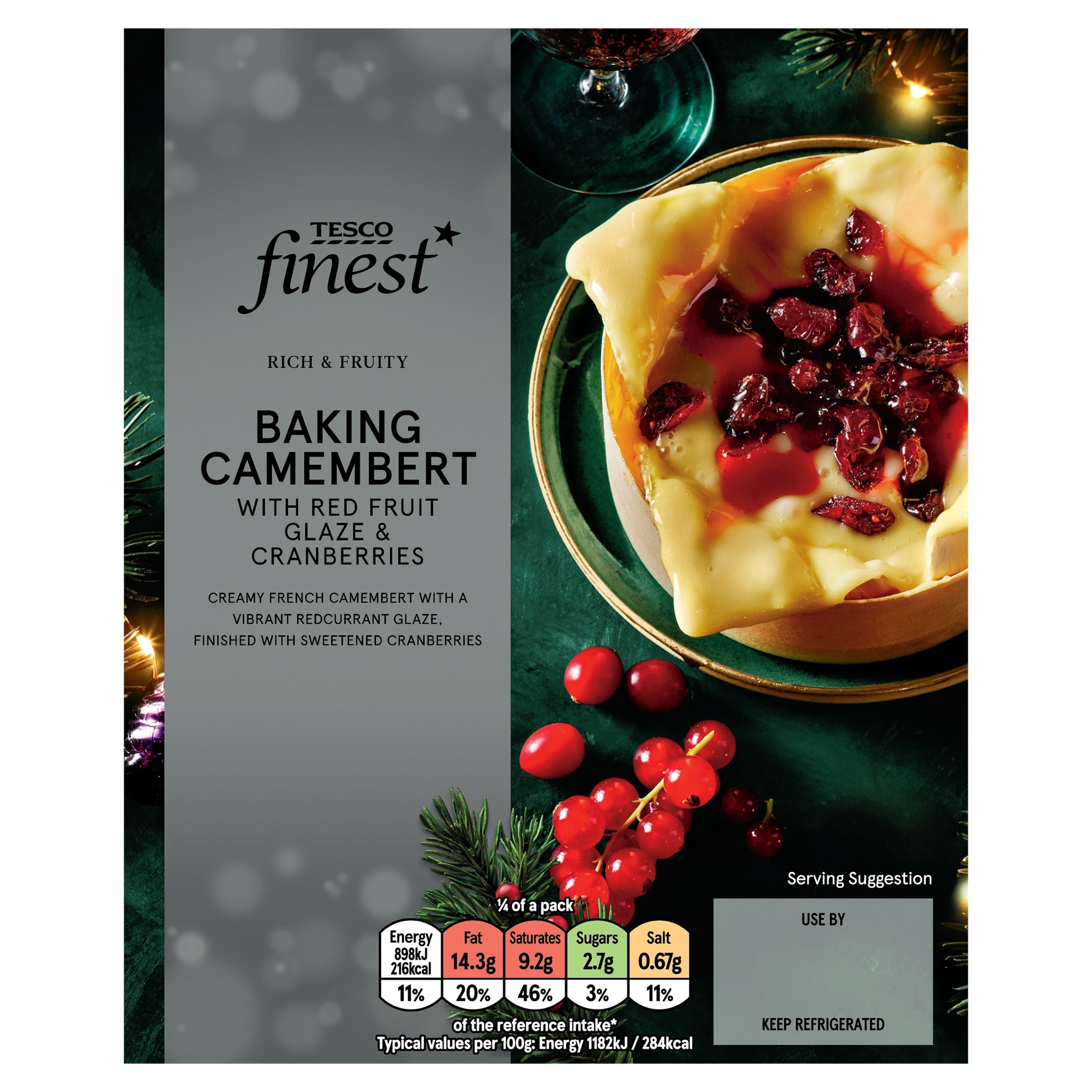 Indulge in TESCO FINEST BAKING CAMEMBERT topped with RED FRUIT GLAZE and CRANBERRIES, perfect for gourmet gatherings and festive occasions.